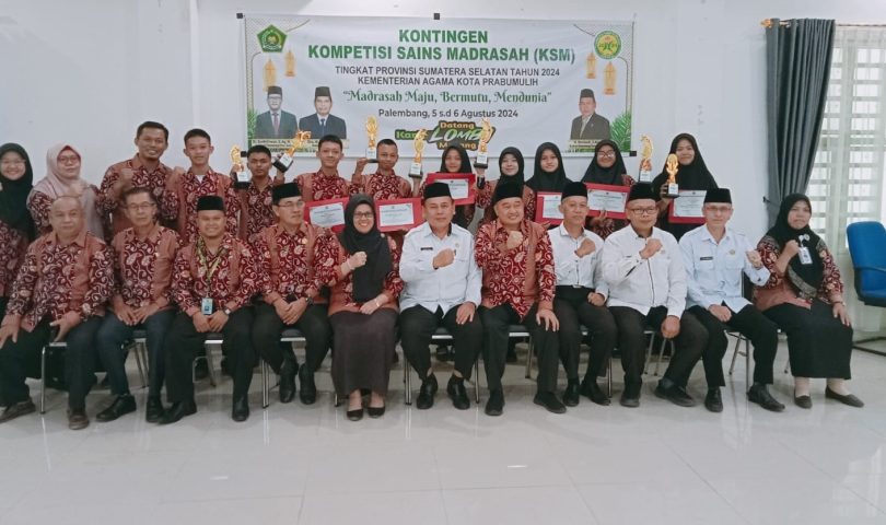 Kepala Kantor Kementerian Agama Kota Prabumulih menyerahkan piala dan piagam penghargaan sebagai bentuk dan wujud apresiasi kepada para siswa juara Kompetisi Sains Madrasah (KSM) Tingkat Kota sekaligus pelepasan Kontingen KSM ke tingkat Provinsi Sumatera Selatan tahun 2024 di Aula PLHUT Kantor Kementerian Agama Kota Prabumulih, Senin (29/7/2024)
